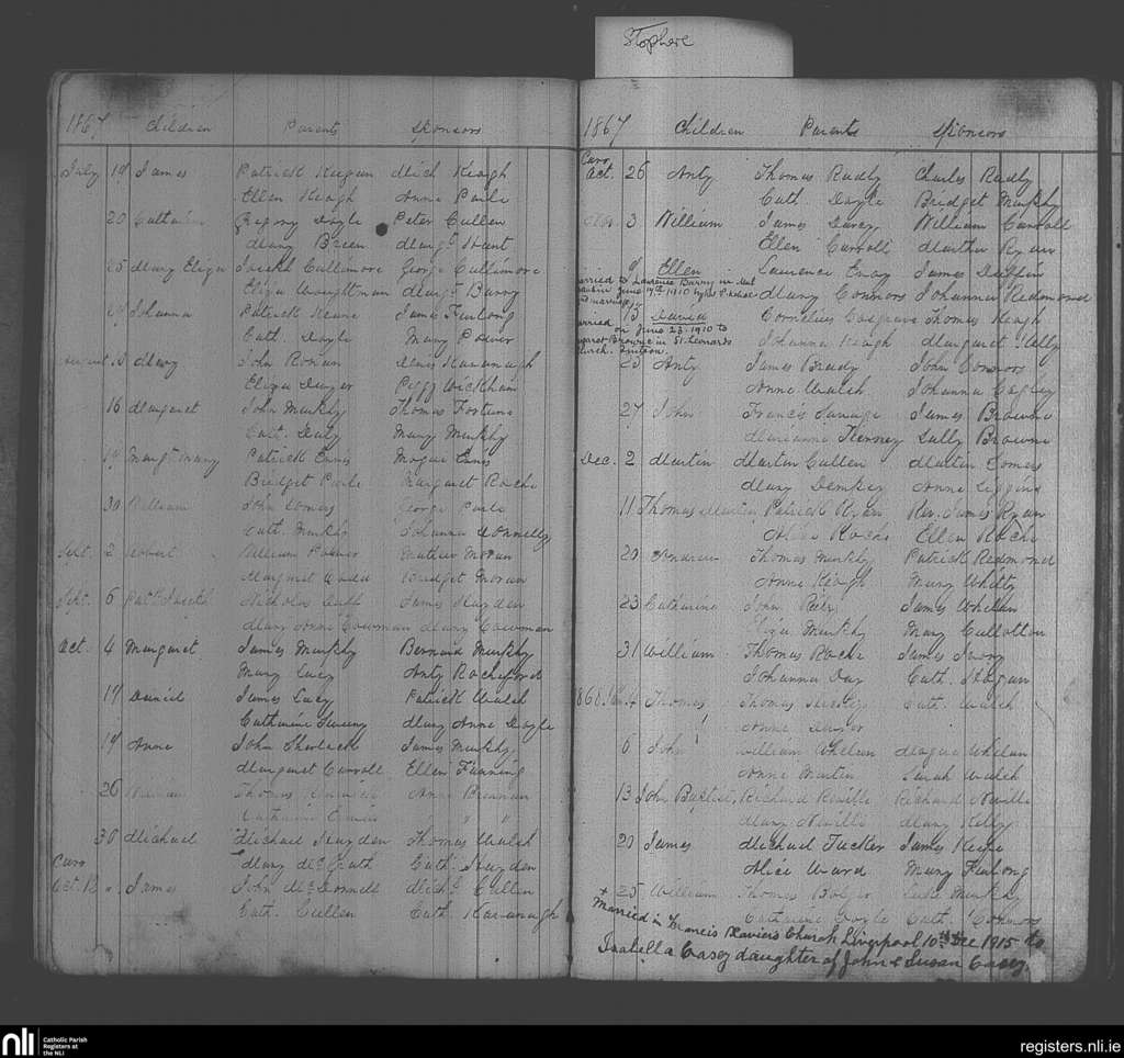 Taghmon; County of Wexford; Diocese of Ferns. Baptisms, Marriages, July 1867 to Dec. 1915