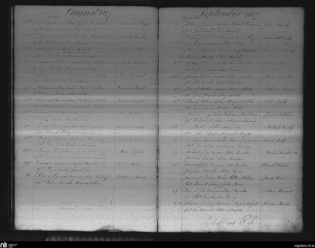 Innishannon; County of Cork; Diocese of Cork and Ross. Baptisms, Aug. 1827 to Sep. 1827