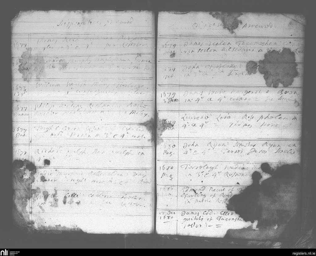 Wexford; County of Wexford; Diocese of Ferns. Dispensations, Jan. 1677 to Aug. 1680
