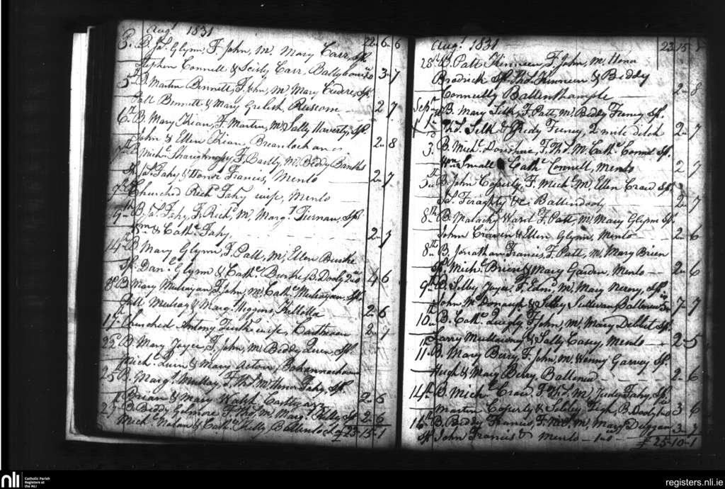 Castlegar; County of Galway; Diocese of Galway. Baptisms, Aug. 1831 to Sep. 1831