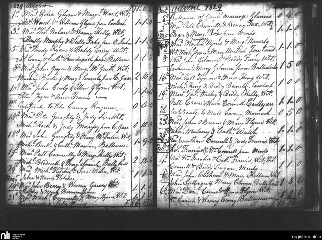 Castlegar; County of Galway; Diocese of Galway. Marriages, Oct. 1829 to Feb. 1830