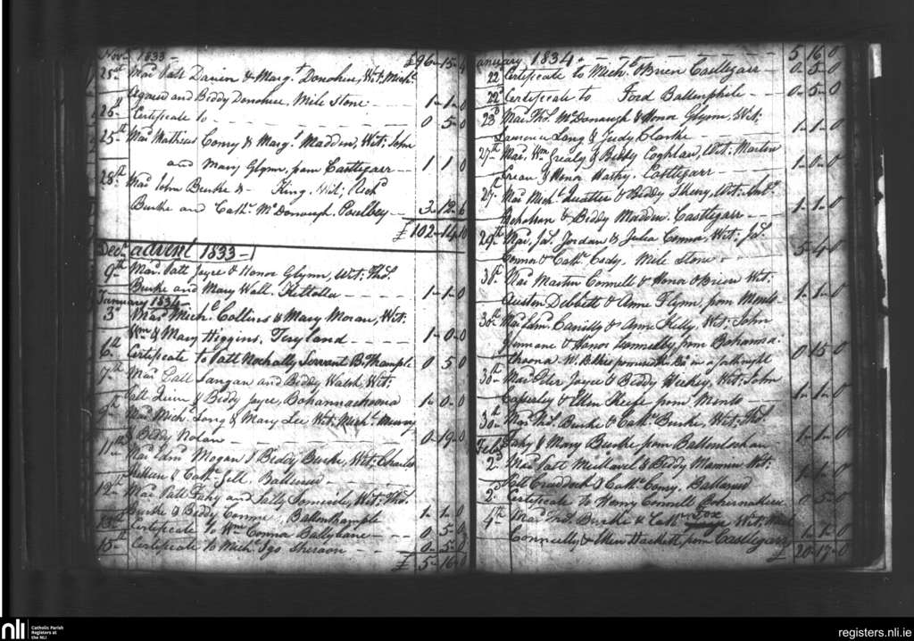 Castlegar; County of Galway; Diocese of Galway. Marriages, Nov. 1833 to Feb. 1834