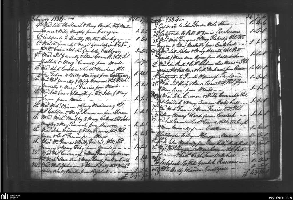 Castlegar; County of Galway; Diocese of Galway. Marriages, Feb. 1834 to Oct. 1834