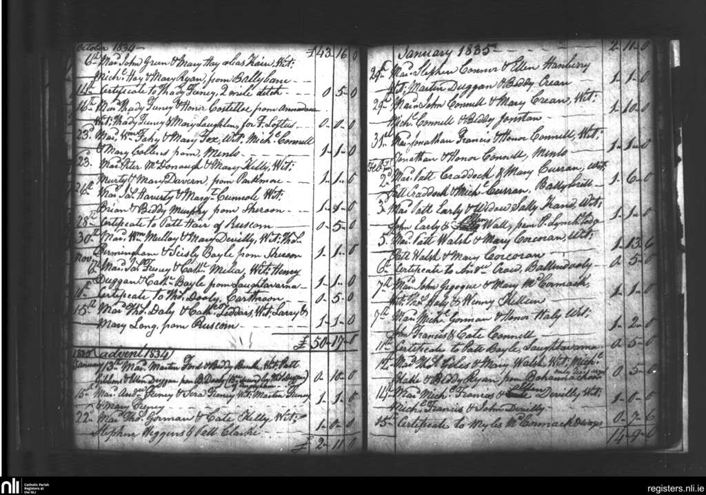 Castlegar; County of Galway; Diocese of Galway. Marriages, Oct. 1834 to Feb. 1835