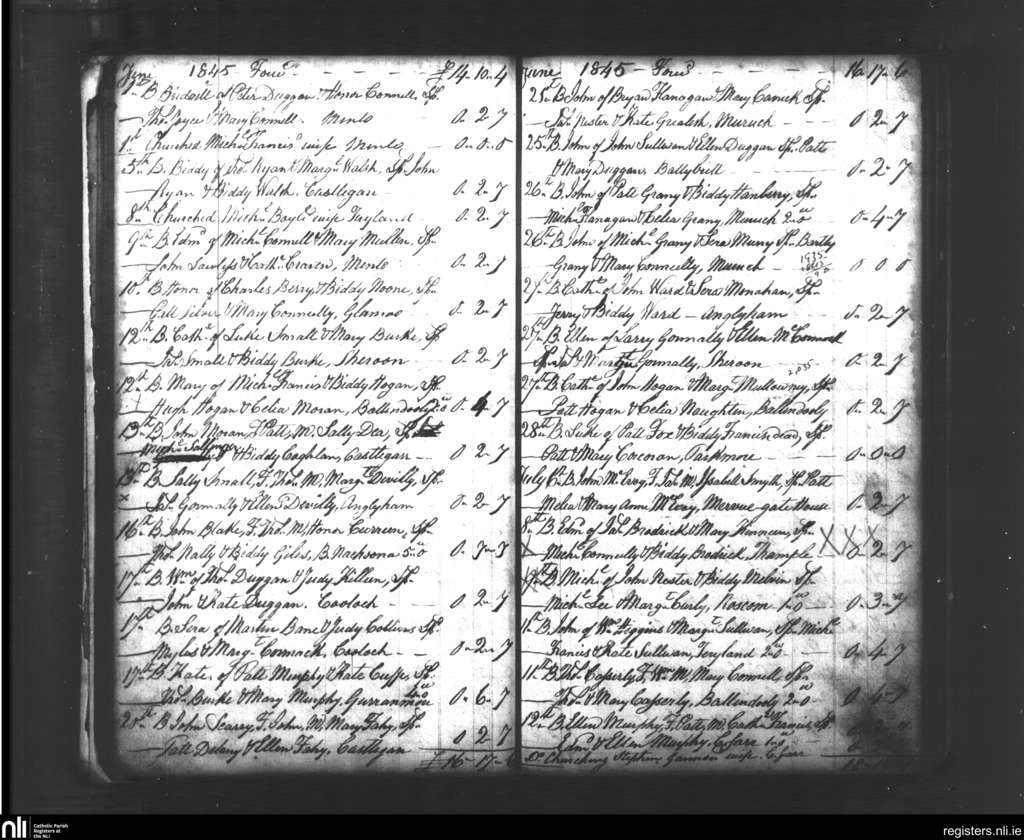 Castlegar; County of Galway; Diocese of Galway. Baptisms, June 1845 to July 1845