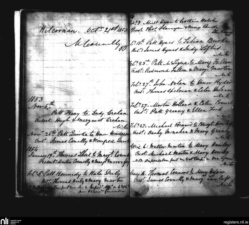 Clarenbridge; County of Galway; Diocese of Galway. Marriages, Oct. 1853 to May 1854