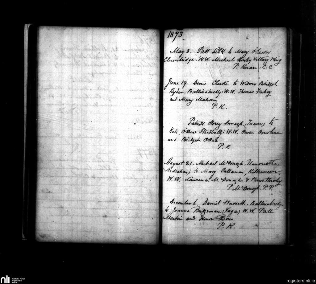 Clarenbridge; County of Galway; Diocese of Galway. Marriages, May 1873 to Dec. 1873