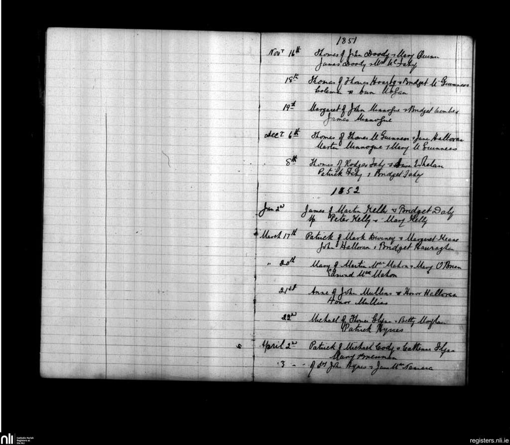 New Quay; County of Clare; Diocese of Galway. Baptisms, Nov. 1851 to Apr. 1852