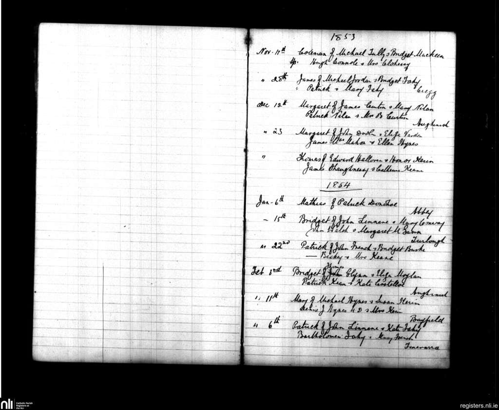 New Quay; County of Clare; Diocese of Galway. Baptisms, Nov. 1853 to Feb. 1854