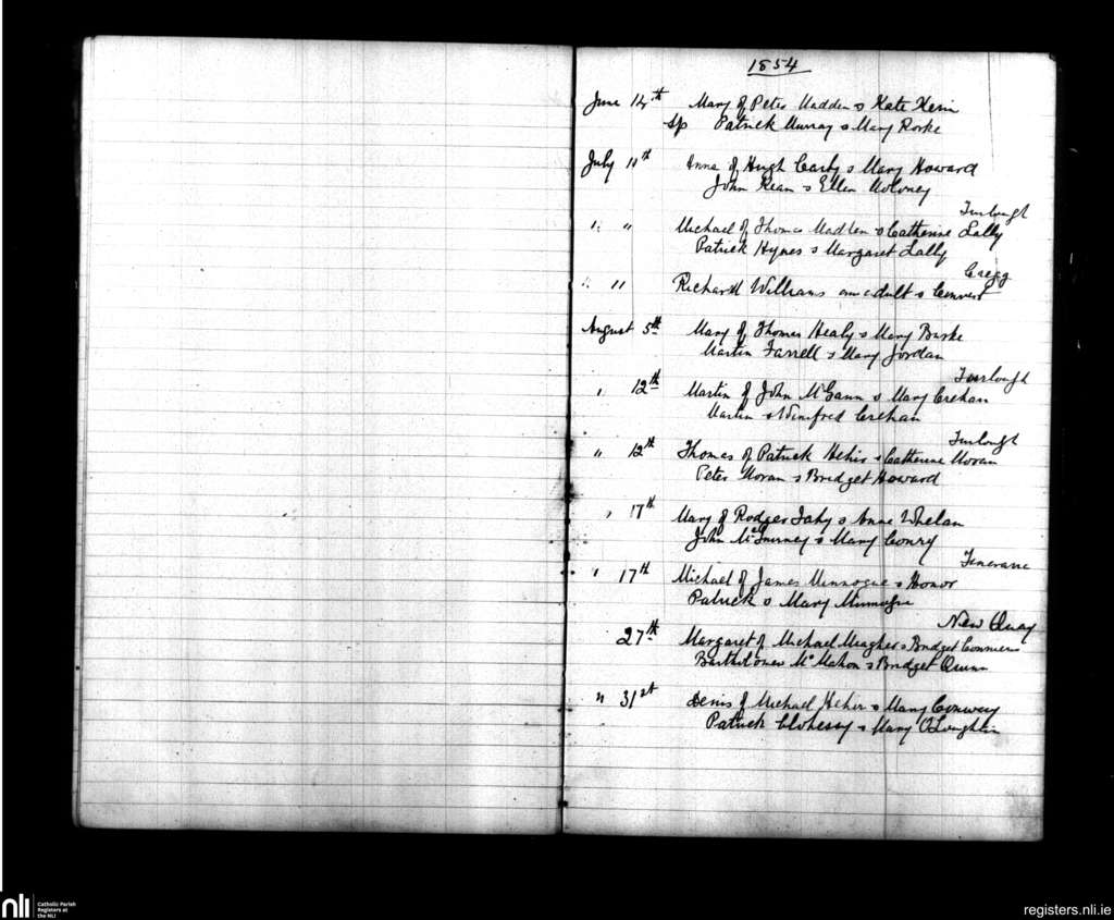 New Quay; County of Clare; Diocese of Galway. Baptisms, June 1854 to Aug. 1854
