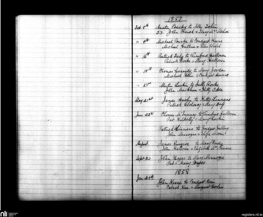 New Quay; County of Clare; Diocese of Galway. Marriages, Feb. 1857 to Jan. 1858
