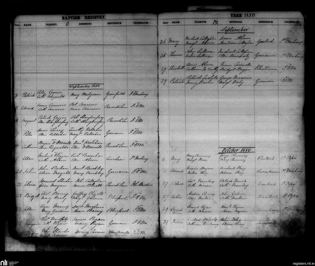 Kanturk; County of Cork; Diocese of Cloyne. Baptisms, Sep. 1850 to Oct. 1850