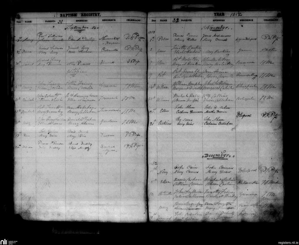 Kanturk; County of Cork; Diocese of Cloyne. Baptisms, Sep. 1852 to Dec. 1852