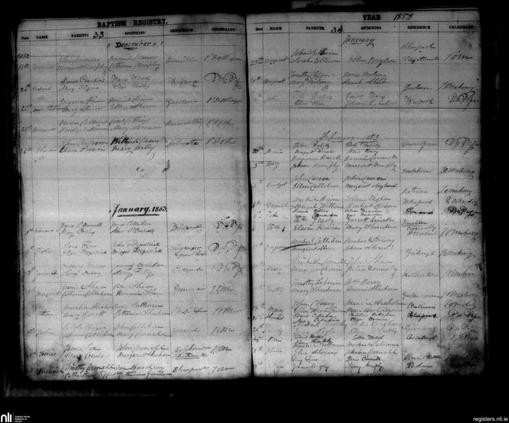 Kanturk; County of Cork; Diocese of Cloyne. Baptisms, Dec. 1852 to Feb. 1853