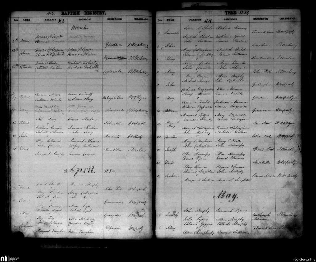 Kanturk; County of Cork; Diocese of Cloyne. Baptisms, Mar. 1854 to May 1854