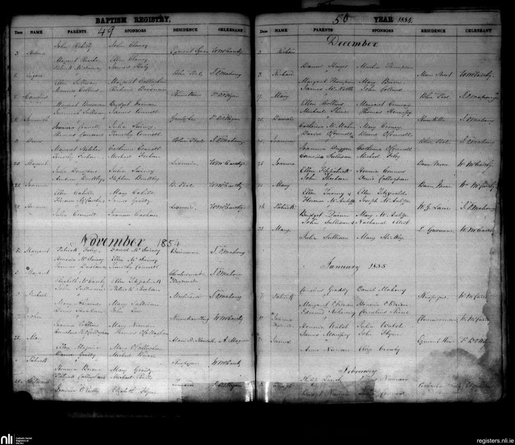 Kanturk; County of Cork; Diocese of Cloyne. Baptisms, Oct. 1854 to Feb. 1855