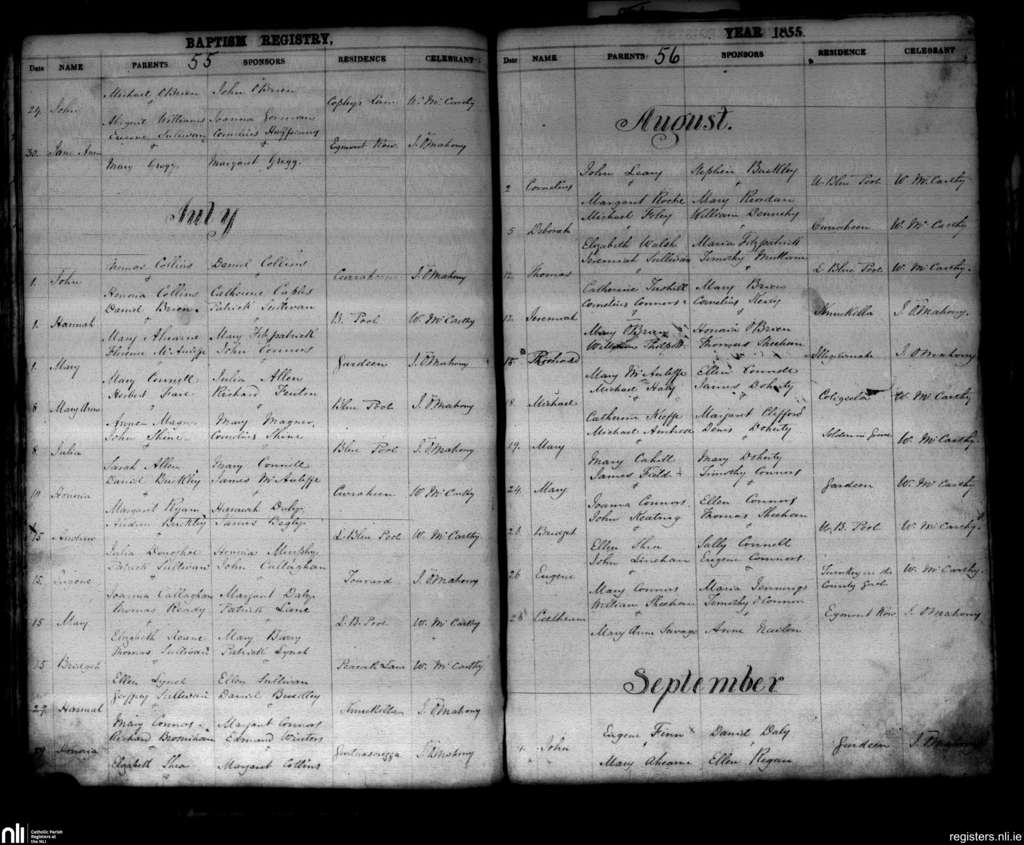 Kanturk; County of Cork; Diocese of Cloyne. Baptisms, June 1855 to Sep. 1855