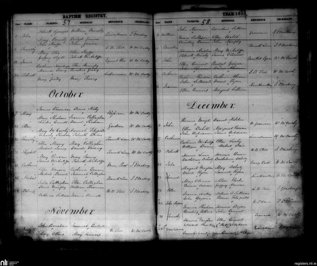 Kanturk; County of Cork; Diocese of Cloyne. Baptisms, Sep. 1855 to Dec. 1855