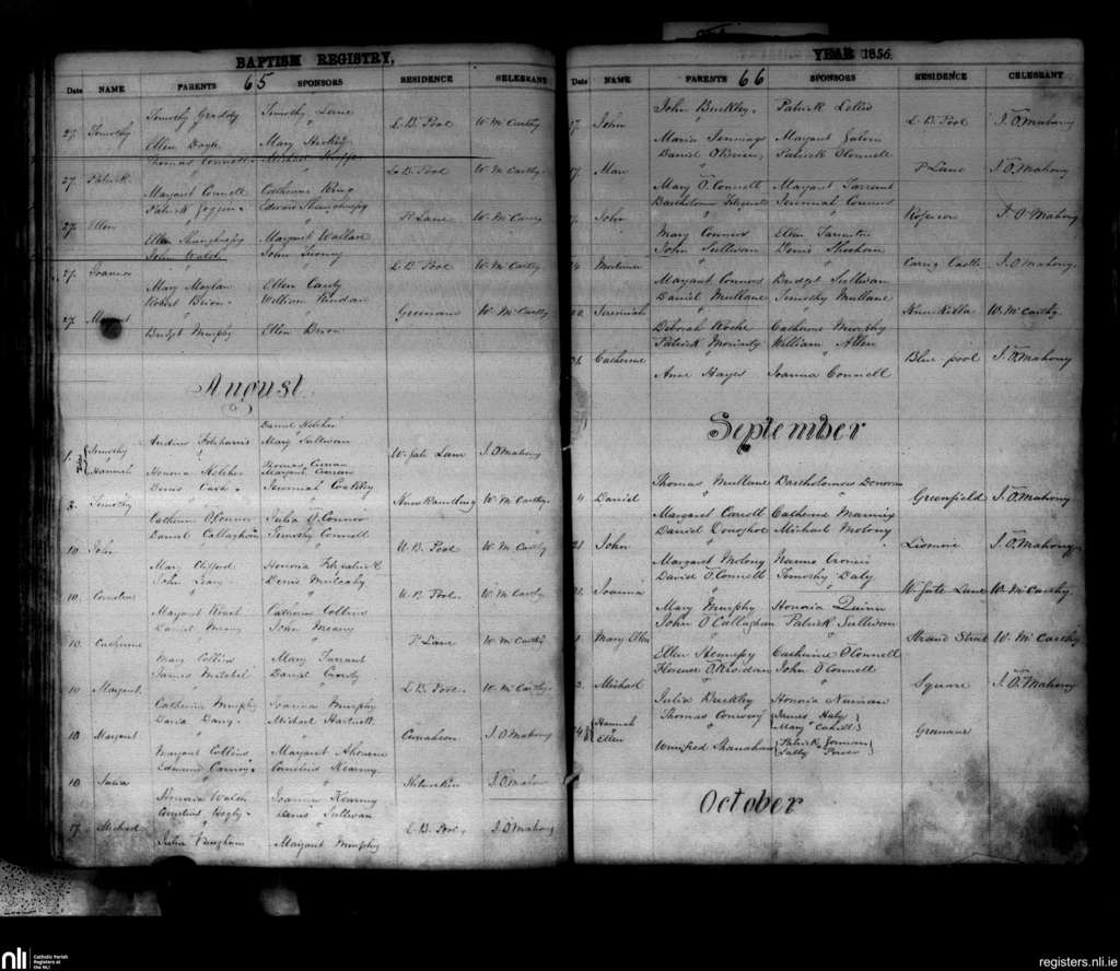 Kanturk; County of Cork; Diocese of Cloyne. Baptisms, July 1856 to Oct. 1856