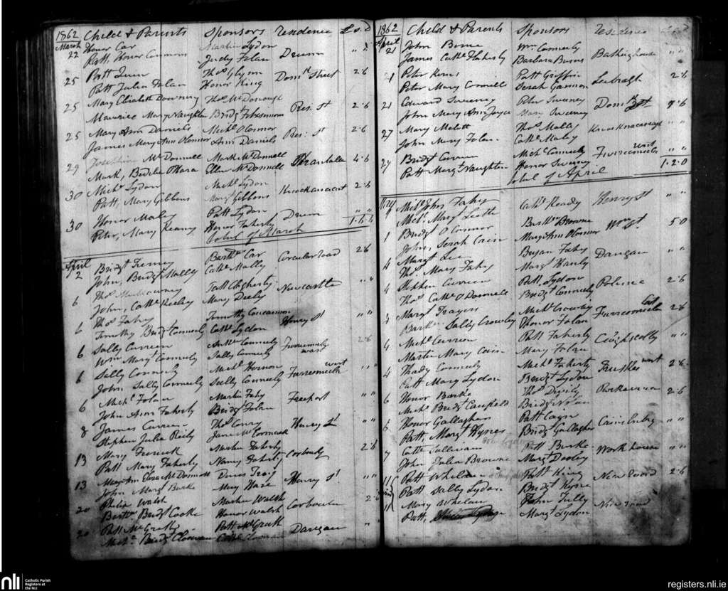 Rahoon; County of Galway; Diocese of Galway. Baptisms, Mar. 1862 to May 1862