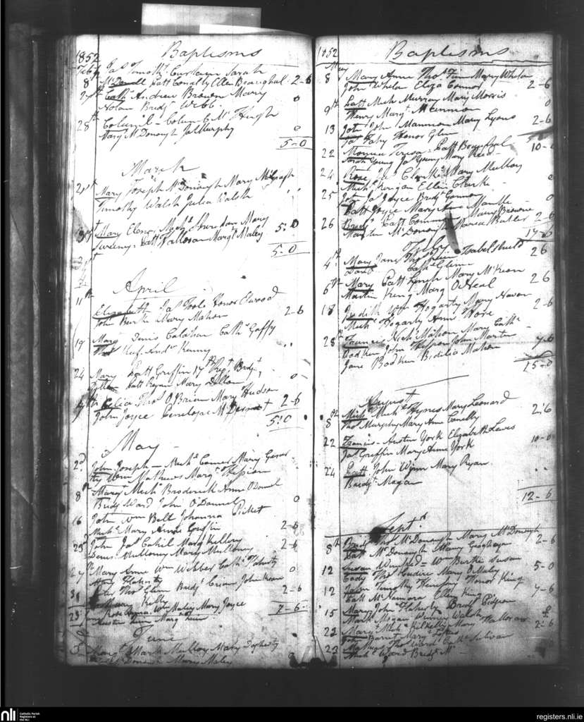 St. Nicholas South and West, Galway city; County of Galway; Diocese of Galway. Baptisms, Feb. 1852 to Sep. 1852