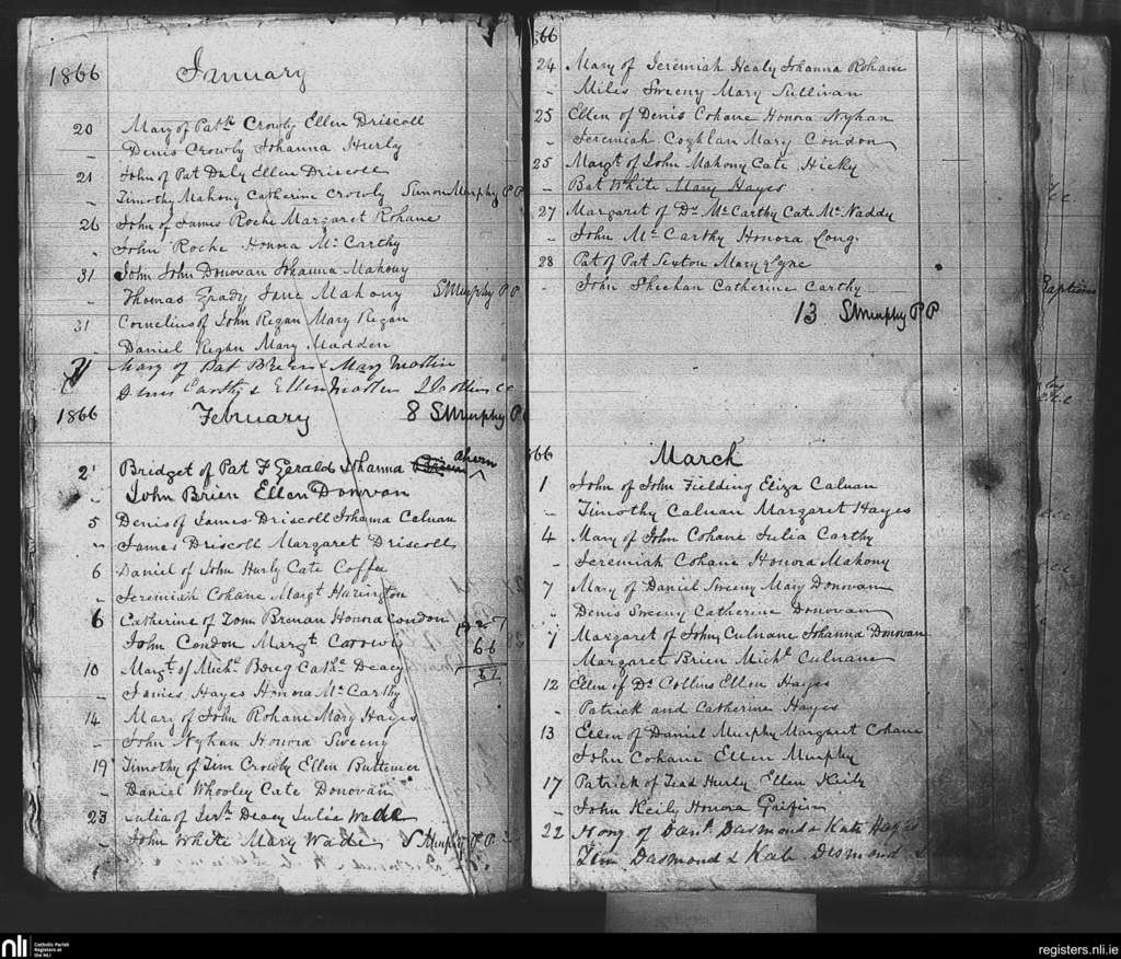 Kilbrittain; County of Cork; Diocese of Cork and Ross. Baptisms, Jan. 1866 to Mar. 1866