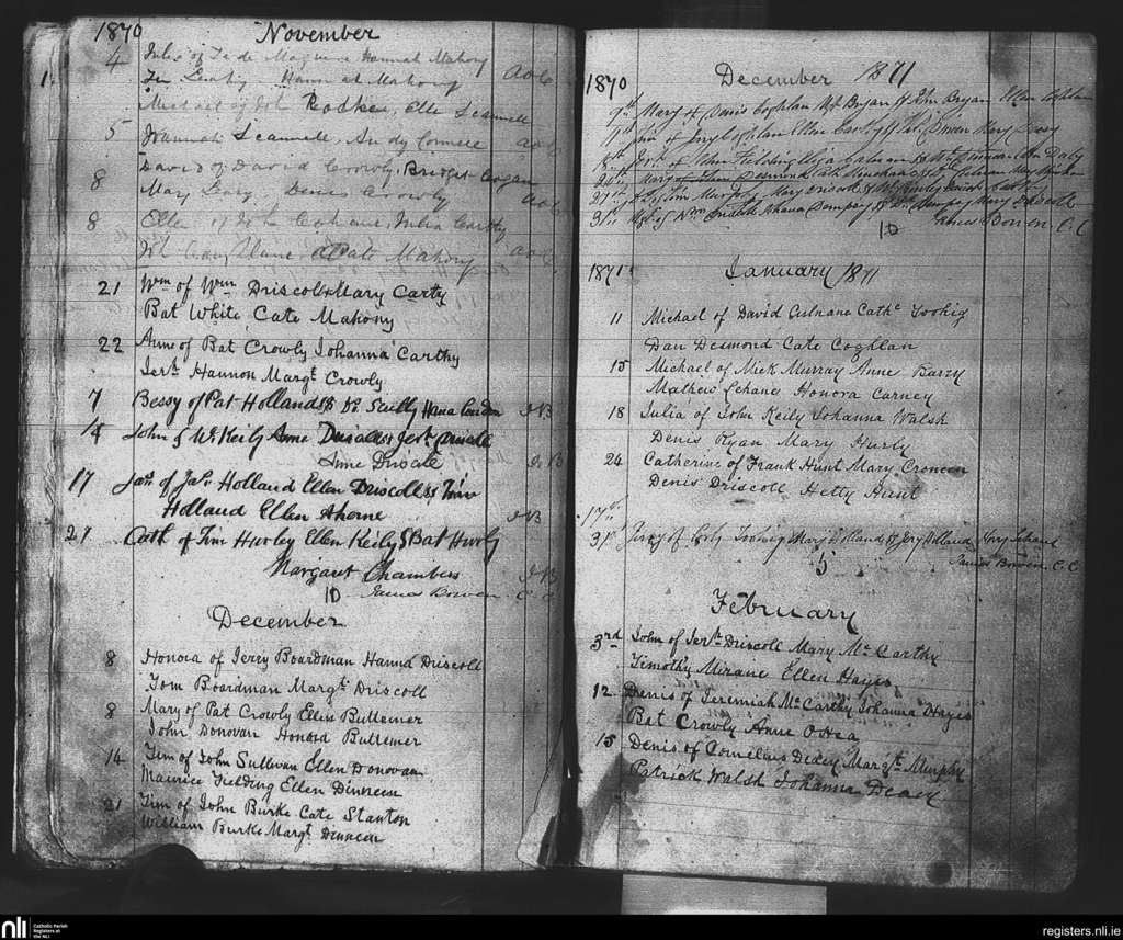 Kilbrittain; County of Cork; Diocese of Cork and Ross. Baptisms, Nov. 1870 to Feb. 1871