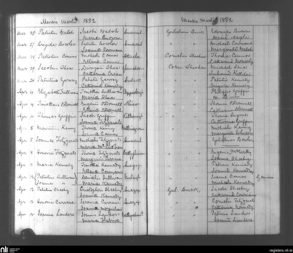 Ballanvohir; County of Kerry; Diocese of Kerry. Baptisms, Mar. 1852 to Apr. 1852