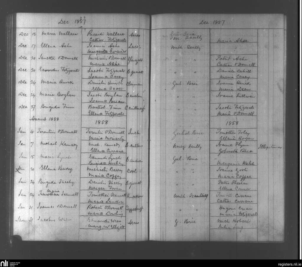 Ballanvohir; County of Kerry; Diocese of Kerry. Baptisms, Dec. 1857 to Jan. 1858