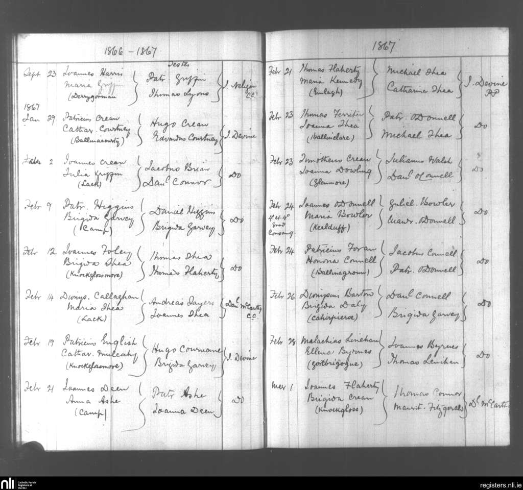 Ballanvohir; County of Kerry; Diocese of Kerry. Marriages, Sep. 1866 to Mar. 1867