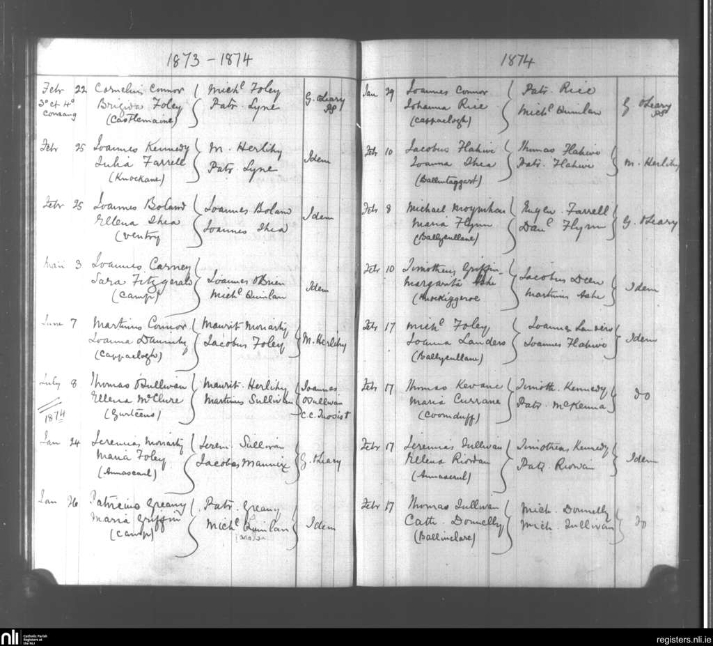 Ballanvohir; County of Kerry; Diocese of Kerry. Marriages, Feb. 1873 to Feb. 1874