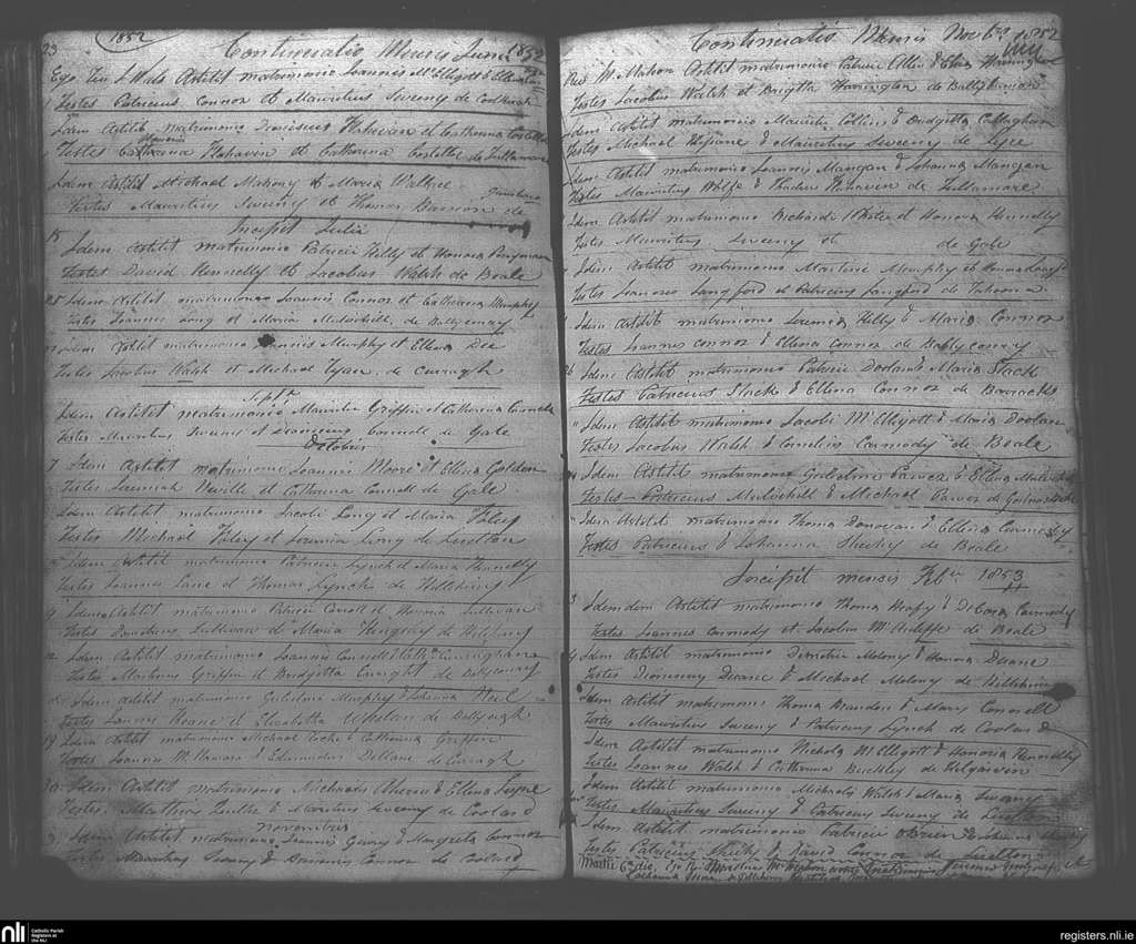 Ballybunion; County of Kerry; Diocese of Kerry. Marriages, June 1852 to Feb. 1853