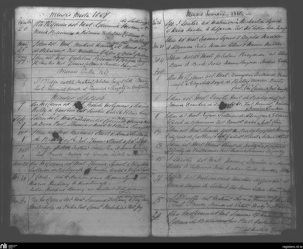 Ballybunion; County of Kerry; Diocese of Kerry. Marriages, Mar. 1867 to Feb. 1868