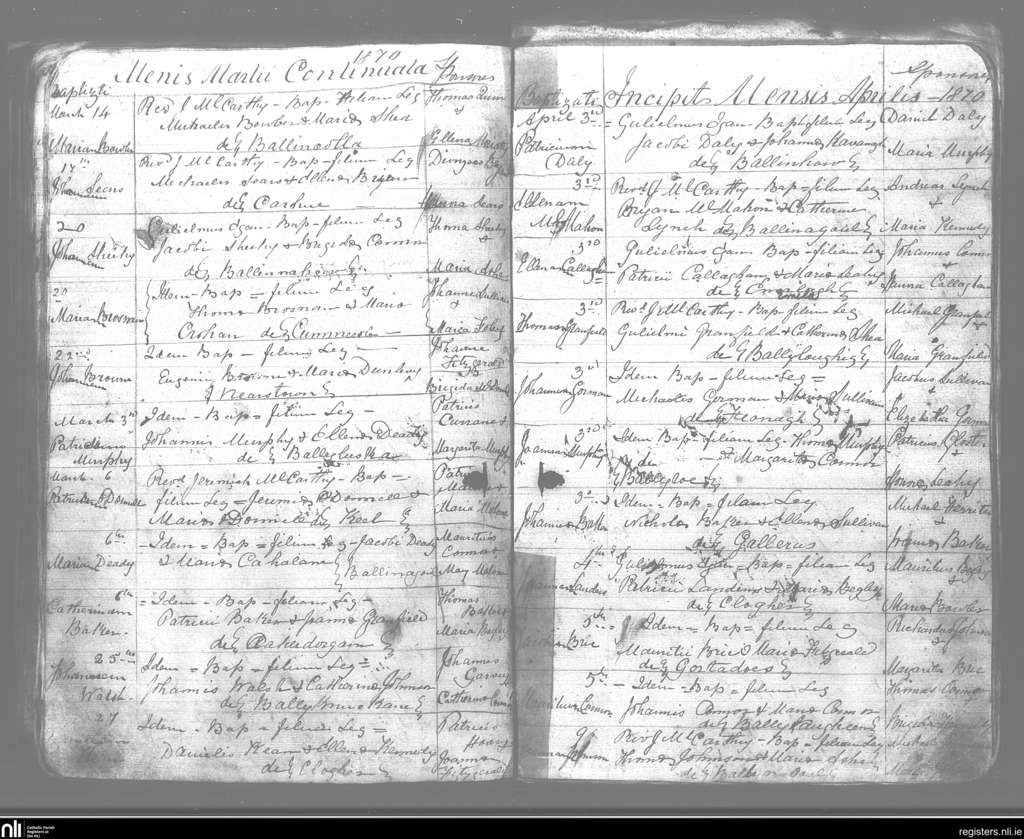 Kilmelchidar; County of Kerry; Diocese of Kerry. Baptisms, Mar. 1870 to Apr. 1870