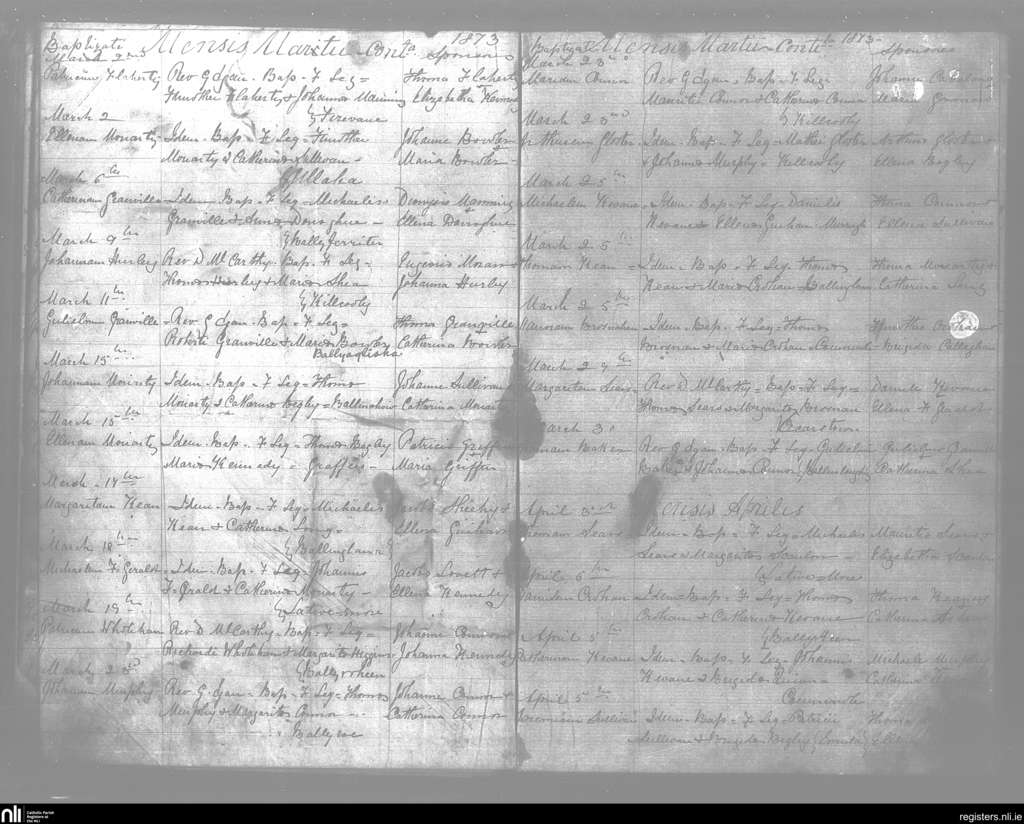Kilmelchidar; County of Kerry; Diocese of Kerry. Baptisms, Mar. 1873 to Apr. 1873