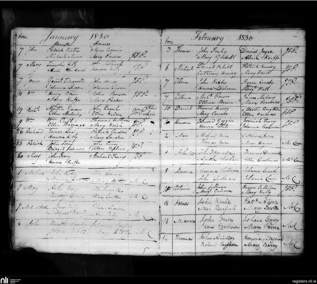 Killeagh; County of Cork; Diocese of Cloyne. Baptisms, Jan. 1830 to Feb. 1830