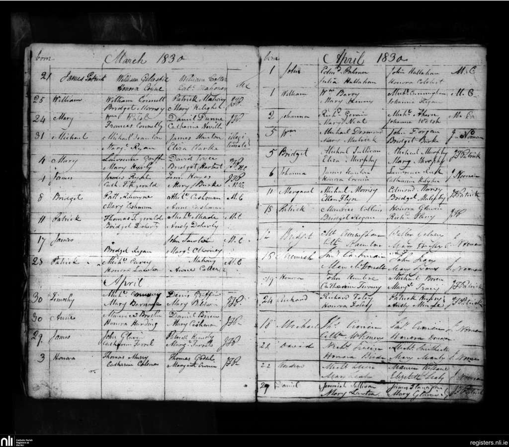 Killeagh; County of Cork; Diocese of Cloyne. Baptisms, Mar. 1830 to Apr. 1830