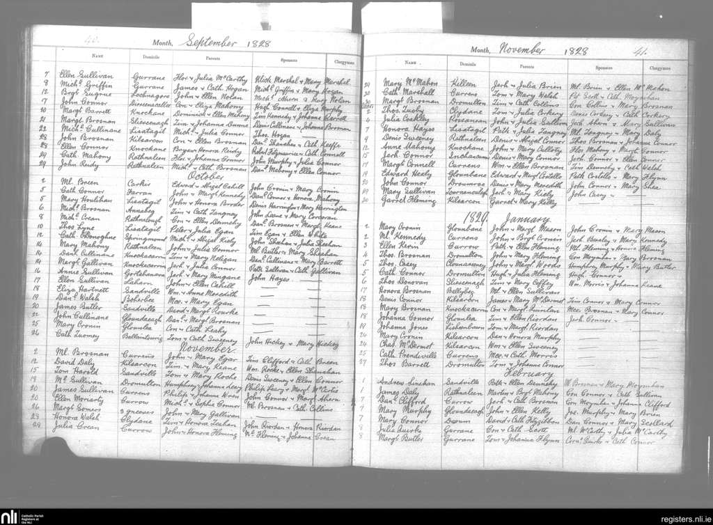 Killeentierna; County of Kerry; Diocese of Kerry. Baptisms, Sep. 1828 to Feb. 1829