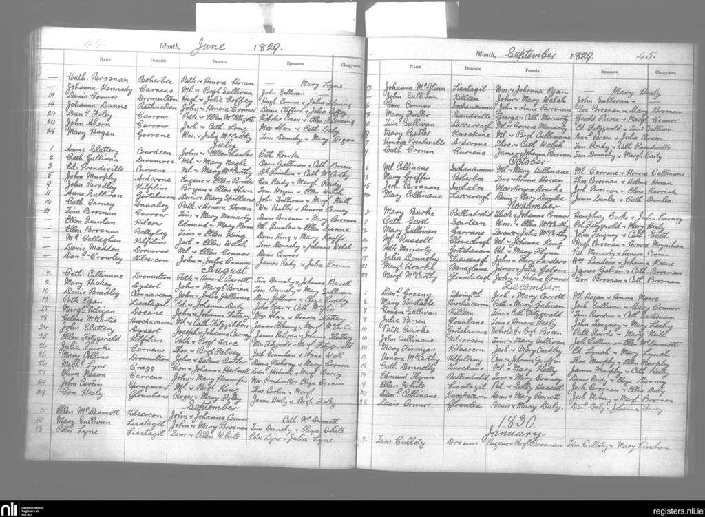 Killeentierna; County of Kerry; Diocese of Kerry. Baptisms, June 1829 to Jan. 1830