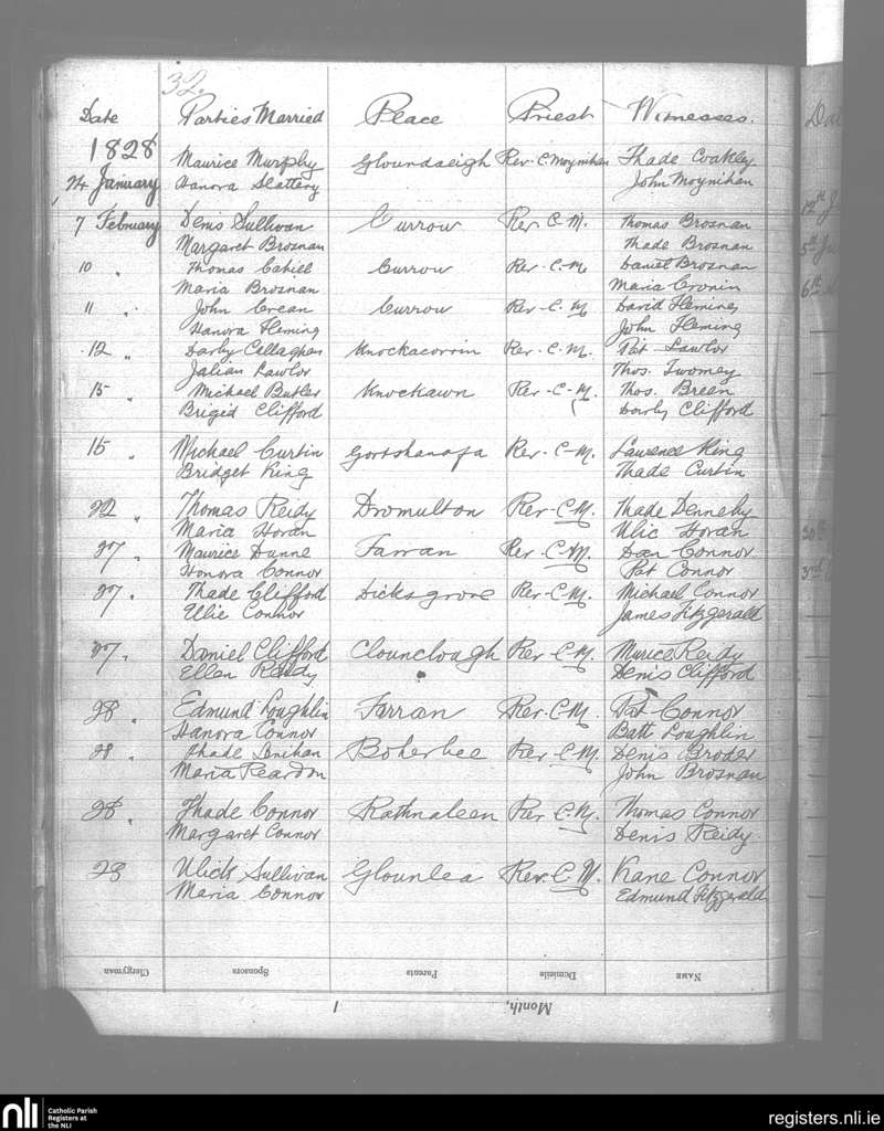 Killeentierna; County of Kerry; Diocese of Kerry. Marriages, Jan. 1828 to Feb. 1828