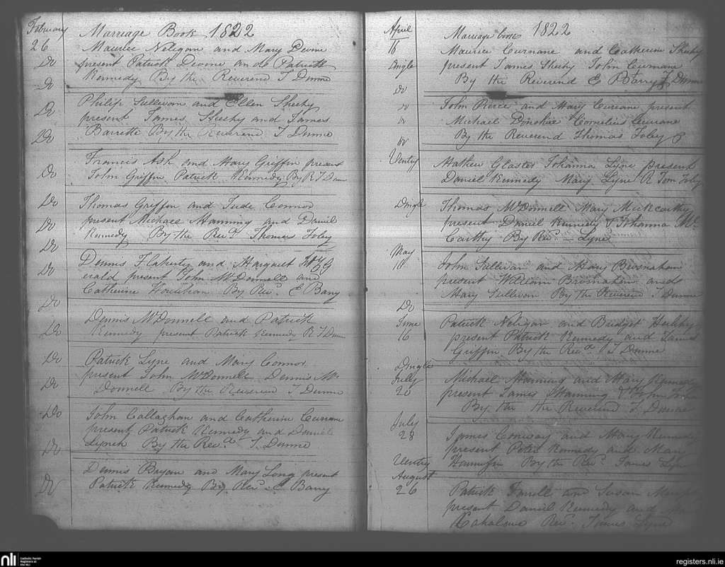 Dingle; County of Kerry; Diocese of Kerry. Marriages, Feb. 1822 to Aug. 1822