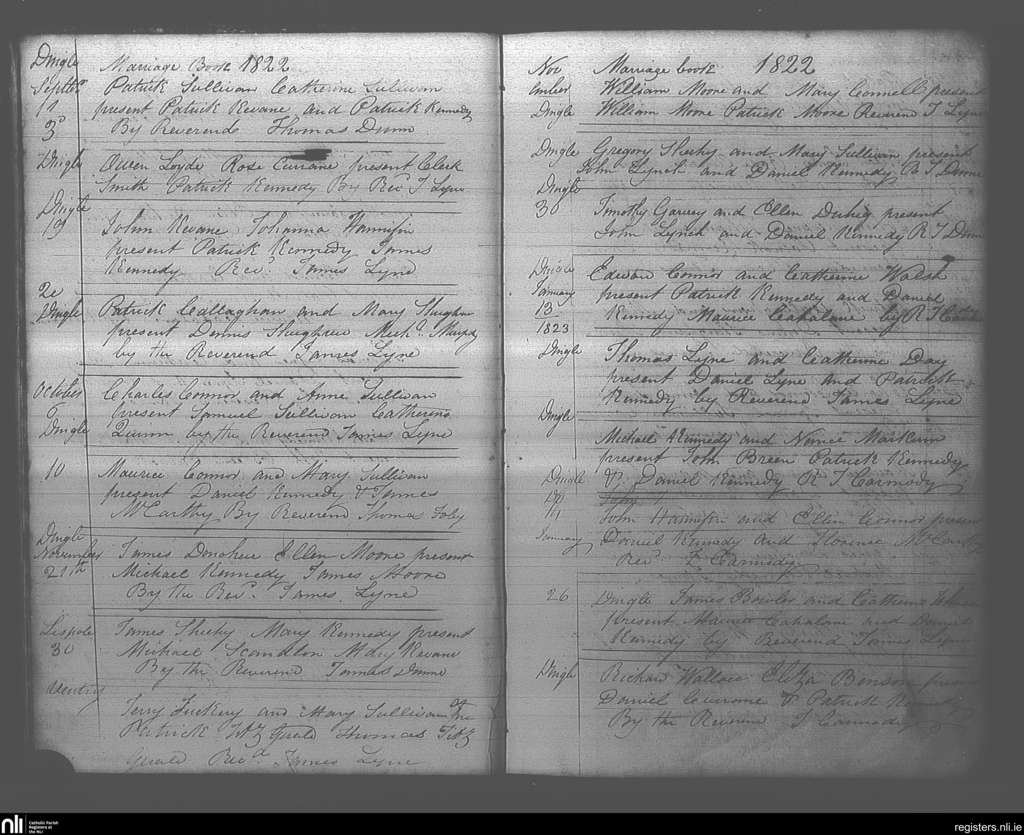 Dingle; County of Kerry; Diocese of Kerry. Marriages, Sep. 1822 to Jan. 1823