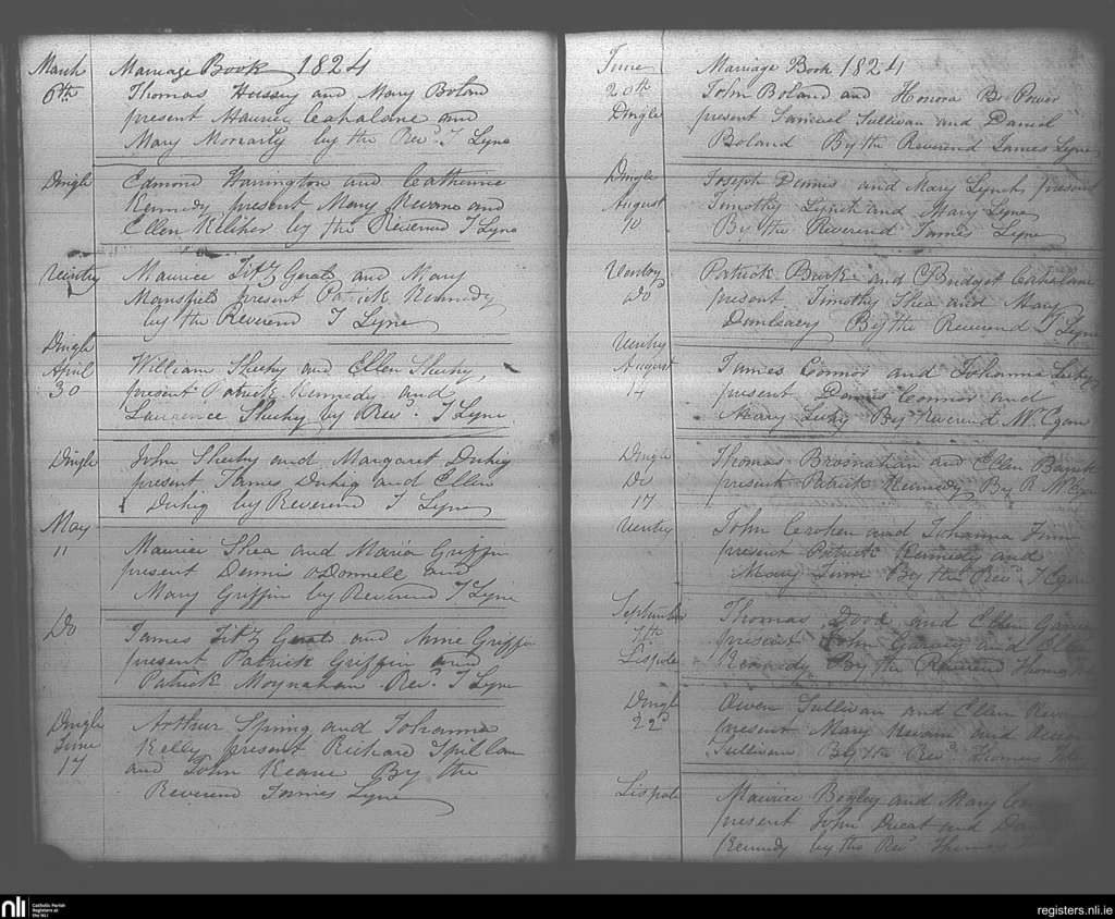 Dingle; County of Kerry; Diocese of Kerry. Marriages, Mar. 1824 to Sep. 1824