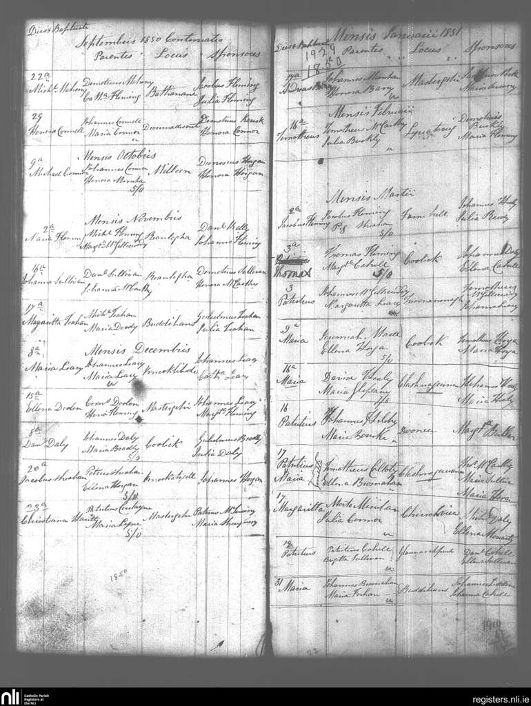 Kilcummin; County of Kerry; Diocese of Kerry. Baptisms, Sep. 1850 to Mar. 1851