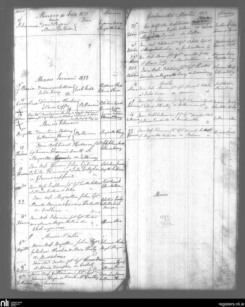 Kilcummin; County of Kerry; Diocese of Kerry. Baptisms, Dec. 1851 to Apr. 1852