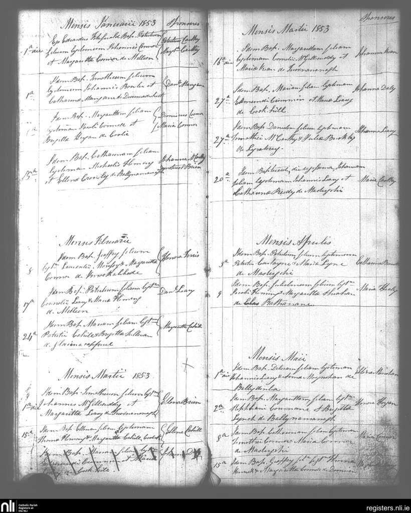 Kilcummin; County of Kerry; Diocese of Kerry. Baptisms, Jan. 1853 to May 1853