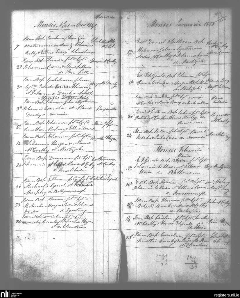 Kilcummin; County of Kerry; Diocese of Kerry. Baptisms, Nov. 1857 to Feb. 1858