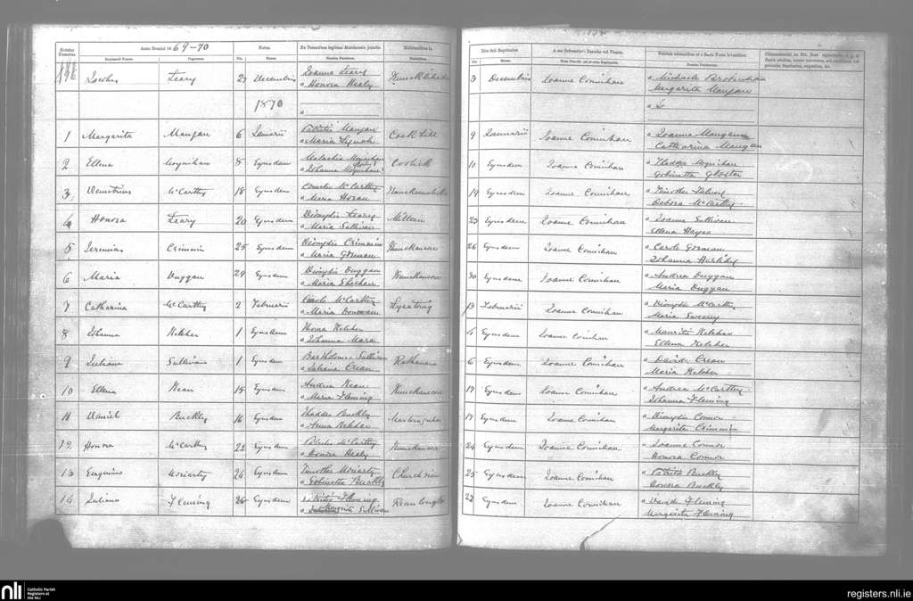 Kilcummin; County of Kerry; Diocese of Kerry. Baptisms, Dec. 1869 to Feb. 1870