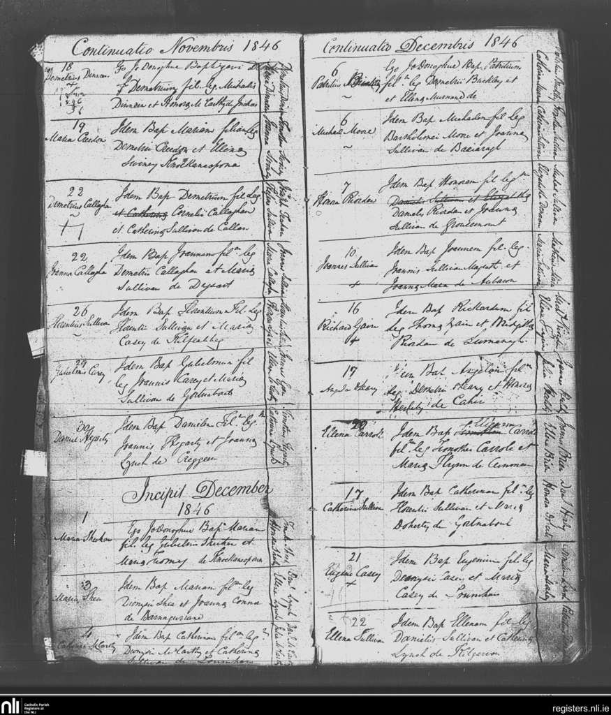 Kilgarvan; County of Kerry; Diocese of Kerry. Baptisms, Nov. 1846 to Dec. 1846