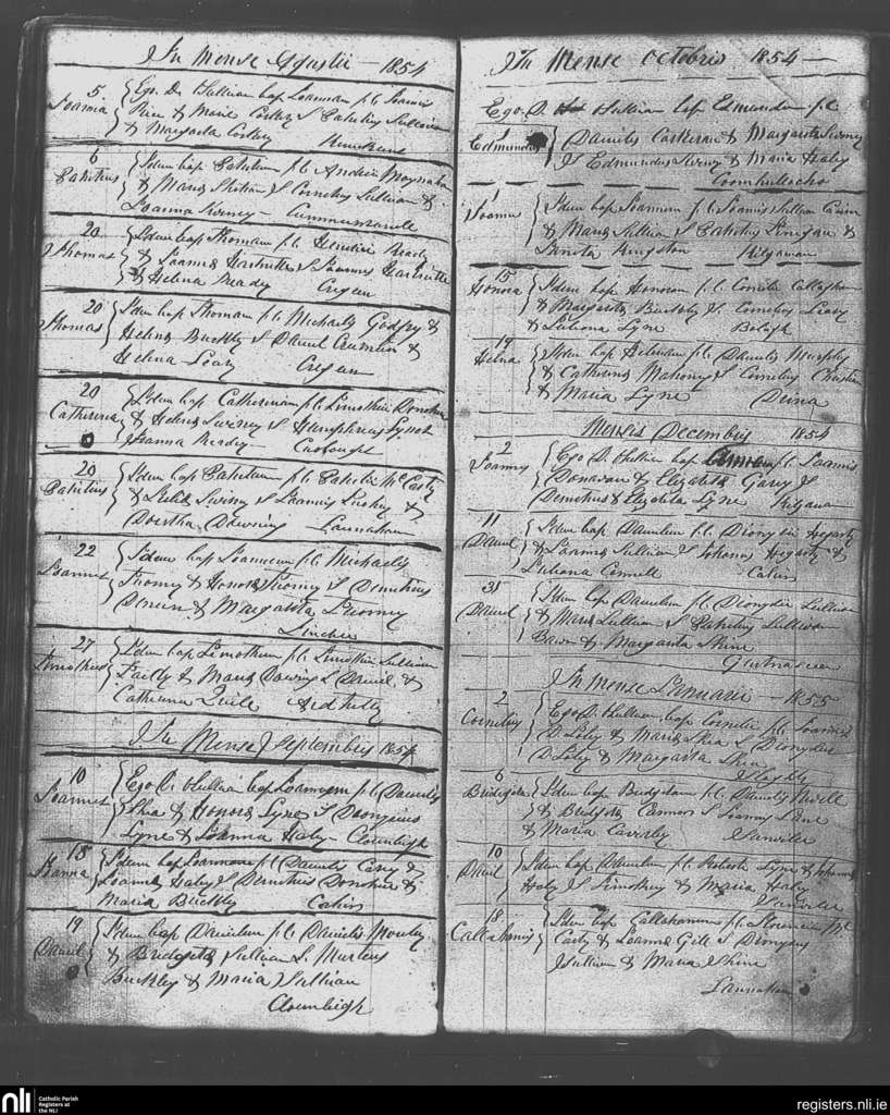 Kilgarvan; County of Kerry; Diocese of Kerry. Baptisms, Aug. 1854 to Jan. 1855